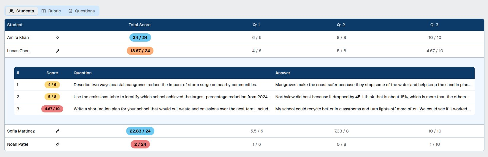The results page has been rebuilt from the ground up with three focused tabs: Students, Rubric, and Questions Overview.